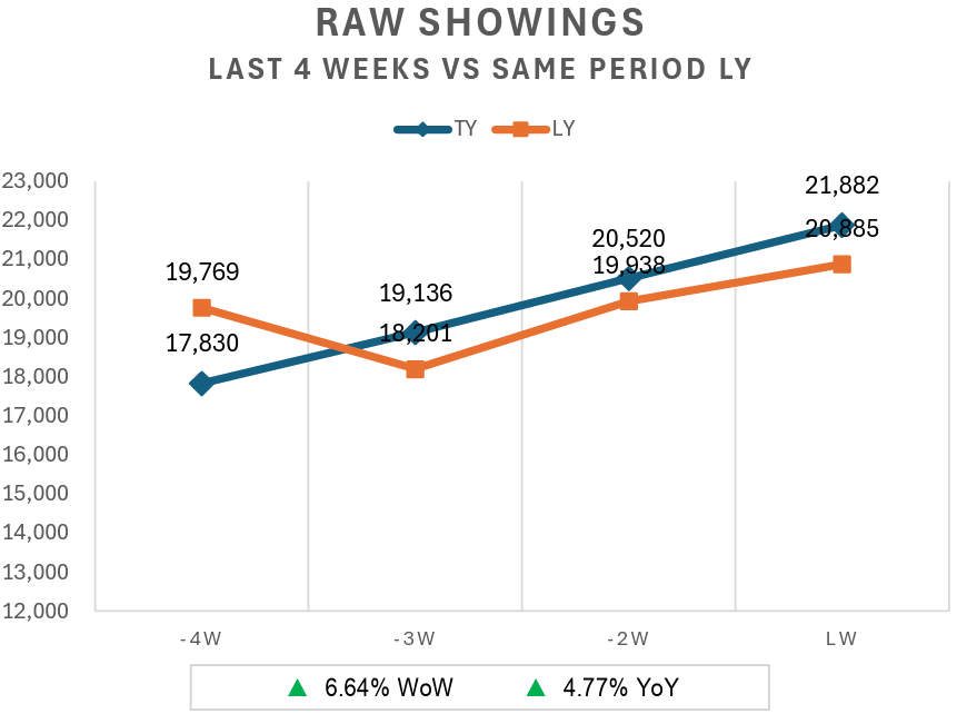 • Raw showings 21,882 ⬆️ 6.6% WoW & ⬆️ 4.8% YoY